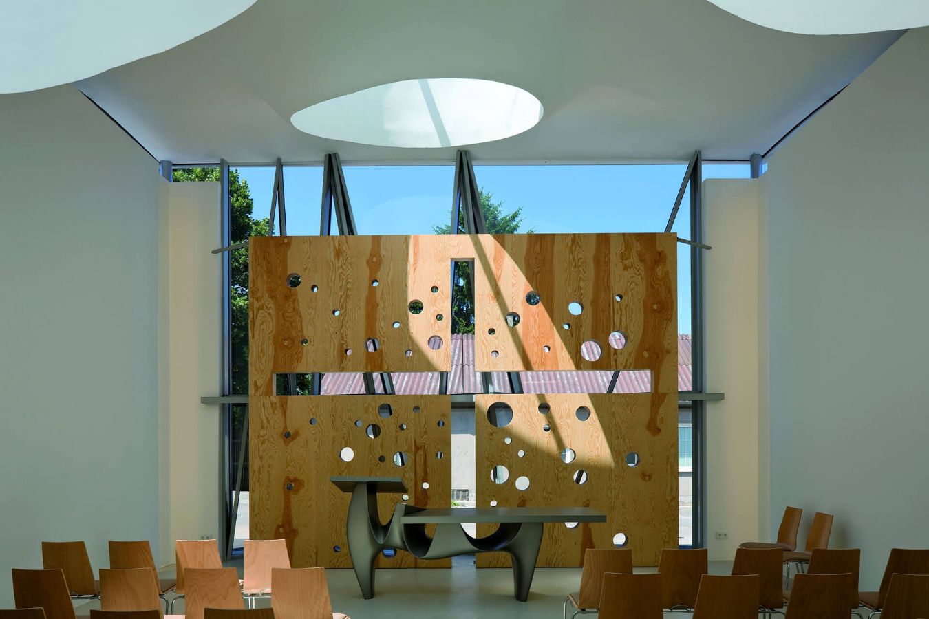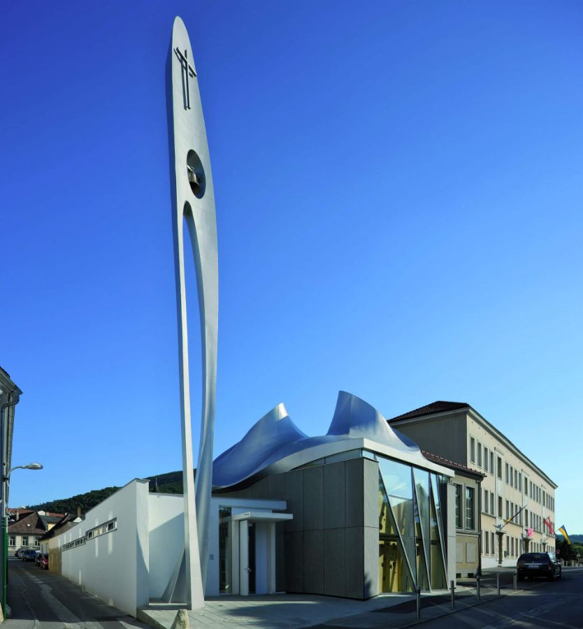 Schlüsselelement des Ensembles aus skulpturalem Glockenturm und Gebäudetrakt ist das sogenannte „Wolkendach“ über dem Ge-betsraum. Seine Formensprache wurde aus der geschwungenen Dachform eines benachbarten romanischen Karners entwickelt. Die Geometrie des jahrhundertealten Gebäudes wurde in eine zeitge-mäße Form übertragen. Mit seiner freien Form und den drei großen lichtspendenden „Vulkanen“ soll das schimmernde Dach die Heilige Dreifaltigkeit, Dogma des christlichen Glaubens, symbolisieren.