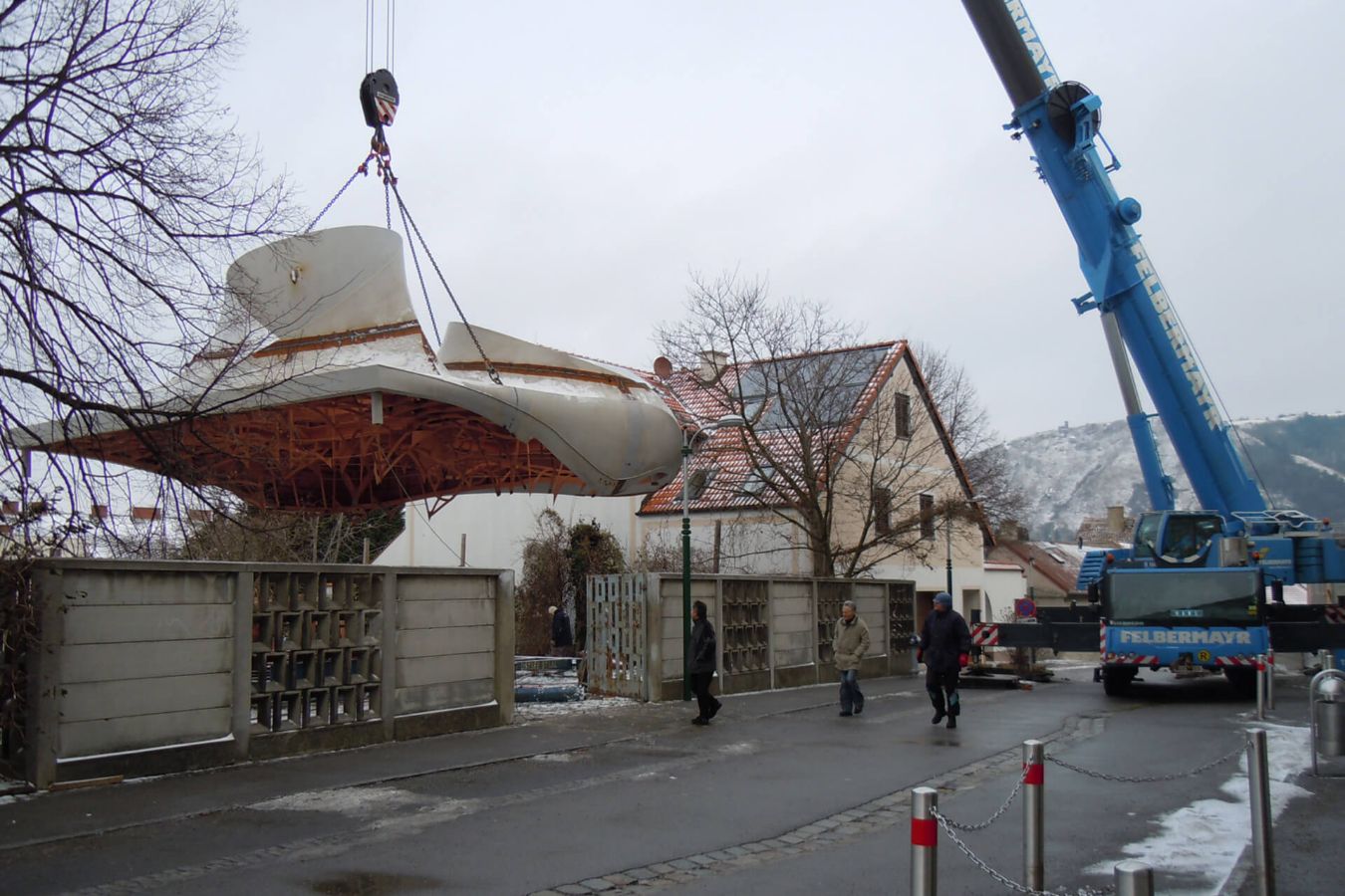 Auf Tiefladern ging die Reise der in drei Segmente geteilten Konstruktion zum 1.000 Kilometer südlicher gelegenen Bestimmungsort. Bei eisigen Temperaturen von minus 15 Grad Celsius wurden die Einheiten zu einem Bauteil verschweißt. Die silberfarbene Deckbeschichtung erfolgte nach dem Einheben des 28 Tonnen schweren Daches auf das Gebäude.